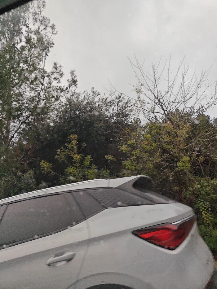 The image captures an overcast daytime scene through a water-splashed window, providing a rear three-quarter view of a light-colored (likely white or silver) crossover SUV, identifiable by its design as potentially a Hyundai Tucson (NX4 generation). The vehicle is positioned in the lower half of the frame, facing towards the right, showcasing its tinted rear window, prominent C-pillar, integrated roof spoiler, and a distinctive angular red taillight on its left side. Roof rails are visible along the top. The background consists of dense, natural vegetation under a uniformly grey, overcast sky. On the far left, tall evergreen trees, possibly pines, extend upwards, displaying visible cones. The central and right portions of the background feature a mix of dark green, dense Mediterranean shrubbery and lighter green foliage, including a deciduous tree with mostly bare branches on the right, indicating a dormant state. The overall environment suggests a natural, vegetated landscape characteristic of the Carmel mountain slopes within Haifa, Israel, likely in an area such as Ahuza, Denia, or French Carmel, known for their green spaces and elevated roads. No individuals are visible in the scene.