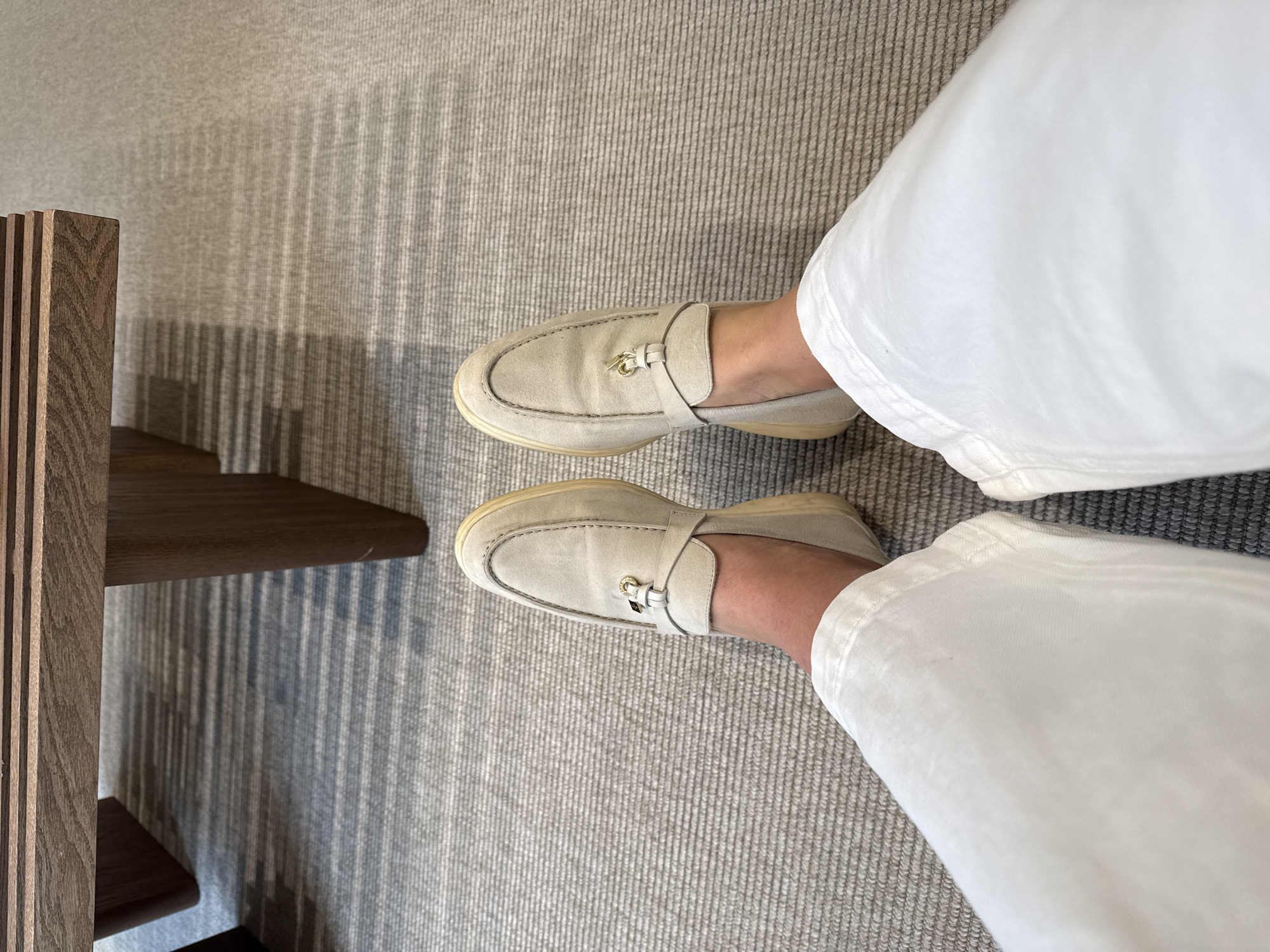 The image presents a first-person, downward perspective of an individual's lower legs and feet within an indoor setting in Málaga, Spain. The subject is wearing white, relaxed-fit trousers and a pair of light beige suede loafers. Each loafer features a strap with a small, gold-colored metallic ornament over the vamp and has a slightly thicker, lighter-colored sole. The feet rest on a grey carpet characterized by a horizontal striped pattern of varying grey tones. In the upper portion of the frame, a dark brown wooden furniture piece, likely a bench or low table with a ridged top surface and solid legs, is partially visible. The lighting is even, suggesting an interior space with ambient illumination. No specific landmarks or unique architectural features are present to further identify the precise location within Málaga from the visual data.