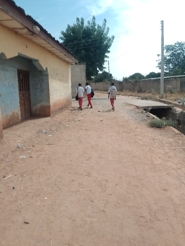 The image captures a daytime scene on an unpaved, reddish-brown dirt road, typical of a residential or semi-urban area. Its precise location within the city of Katsina, Nigeria, or proximity to Muhammadu Dikko Stadium cannot be determined from the visual information presented. Three young individuals, appearing to be males, are walking away from the viewer in single file, progressing towards the background. They are dressed in white short-sleeved shirts and red full-length trousers, consistent with a school uniform. Each carries a bag: the first individual has a black shoulder bag, and the subsequent two are equipped with light-colored backpacks. On the left side of the image, a weathered, single-story building is visible. Its walls are painted a faded light cream-yellow, transitioning to a reddish-brown hue at the base. A brown wooden door with vertical bars is set into a light blue painted section of the wall. The roof features an overhang constructed from corrugated metal sheets, with a spherical light fixture mounted below it. Small pieces of debris are scattered on the dirt ground directly in front of the building. The foreground and central path of the road show visible tire tracks and footprints, alongside scattered small debris including light-colored fragments. On the right side of the image, a concrete slab bridges a visible ditch or culvert, which contains some dry vegetation. Further along the road, a tall, grey utility pole stands. A low, weathered concrete wall, exhibiting staining, runs parallel to the road, demarcating the edge of the property. In the background, a large, dense green tree is visible. Power lines span across a bright, slightly hazy sky. Distant trees and faint structural outlines can be observed beyond the concrete wall. The scene is illuminated by natural daylight.