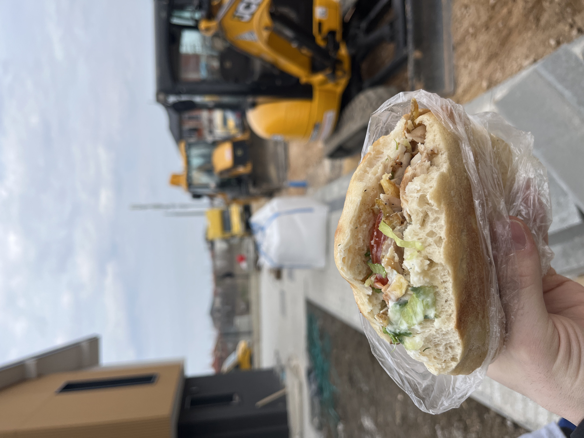 A human hand, presumably male, holds a pita-style sandwich, likely a doner or gyros, filled with cooked meat (appearing to be chicken), shredded lettuce, diced tomatoes, and a creamy white sauce. The sandwich is partially wrapped in a clear plastic bag. The background depicts an active construction site in Branipole, Bulgaria, under an overcast sky. Two yellow heavy machinery vehicles are prominent in the mid-ground, with a clear "JCB" logo visible on the closer compact excavator. Another yellow vehicle, possibly a backhoe or loader, is further behind it. To the left, a modern, multi-story building with light brown exterior panels and dark gray lower sections is under construction. The ground is a mix of brown earth/mud and newly laid concrete or pavement. A large white bulk bag rests on the ground in the mid-distance. Blurred residential structures are visible on the horizon.