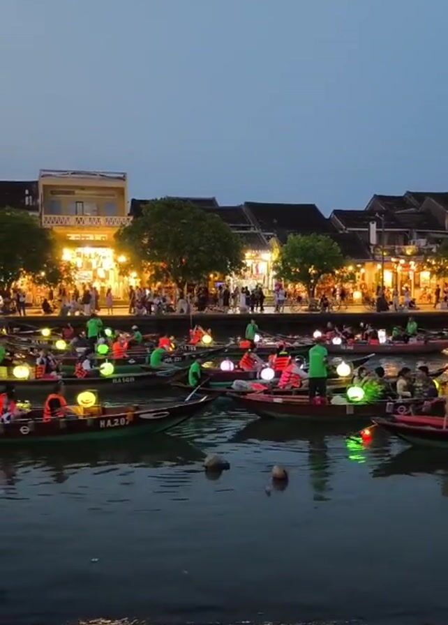 river scene at dusk. Numerous small boats, each carrying several people, are clustered together on the water. Each boat is decorated with illuminated lanterns. People in the boats are wearing life vests. On the riverbank, buildings are visible, lit by lights, and many people are walking along the waterfront. The sky is an even, dark shade of blue. The water reflects the lights from the boats and buildings.