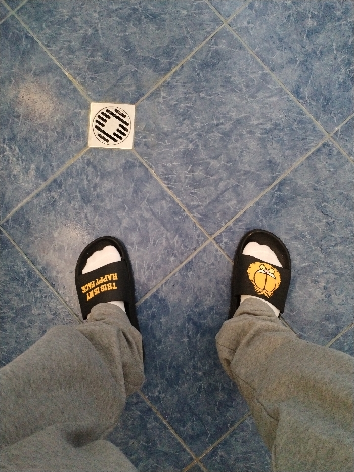 A first-person, downward-angle photograph depicts a person's lower legs and feet on a tiled floor in Graf Ignatievo, Bulgaria. The floor is composed of square, blue tiles with a mottled, marble-like pattern and light-colored grout lines. A white, square floor drain cover with a circular, black-slatted grate is positioned centrally in the upper half of the frame. The subject wears grey sweatpants and white socks. Black slide sandals are worn over the socks; the left sandal features yellow text that reads "THIS IS MY HAPPY FACE" (visible inverted to the viewer), and the right sandal displays a cartoon illustration of Garfield's head. No other individuals or significant environmental features are discernable.