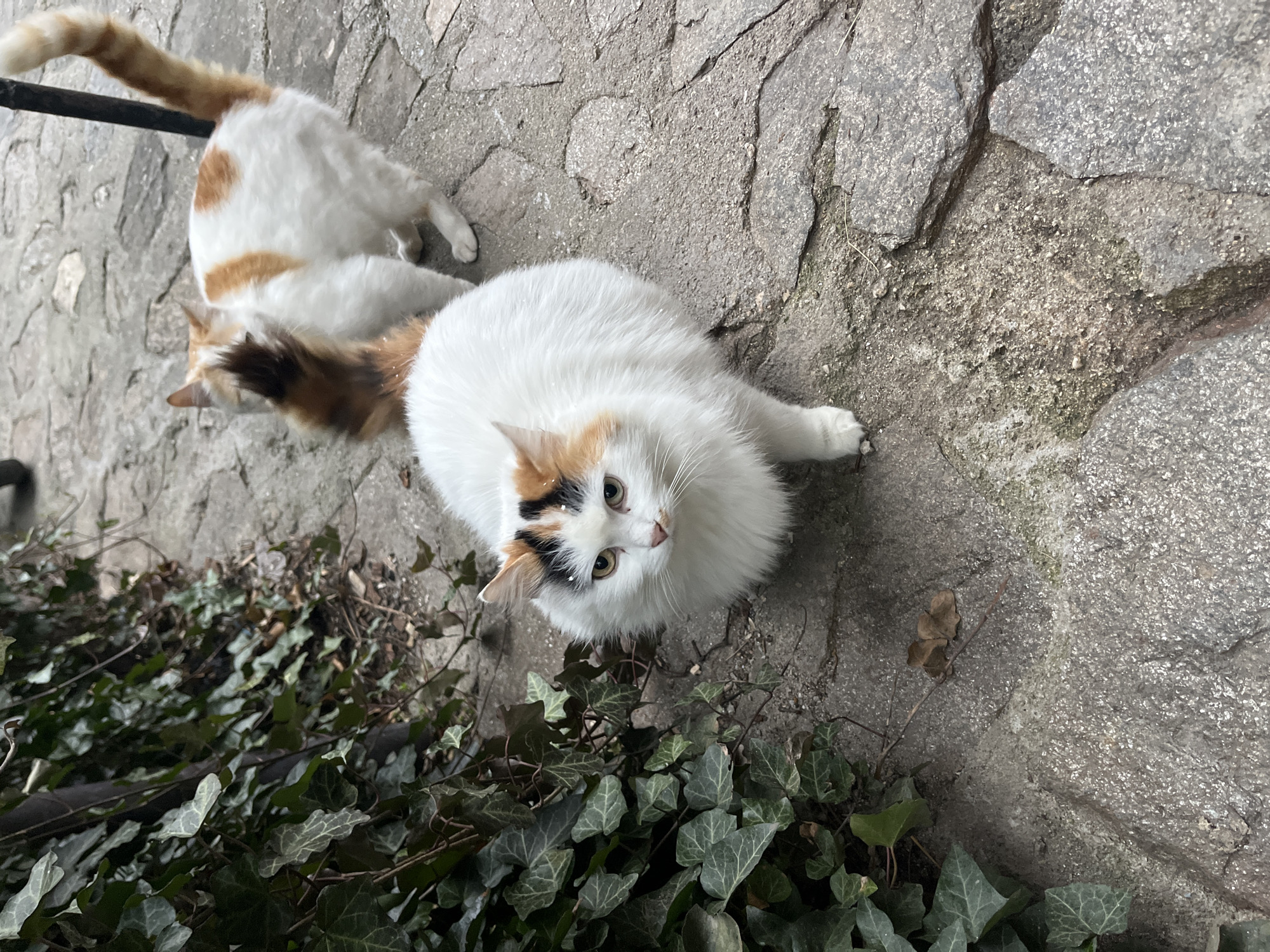 three cats on a stone surface with ivy growing along the bottom edge. The cat closest to the viewer is white with brown and black markings on its head, looking up at the camera. Behind it is another cat with similar coloration, facing away. A third white cat with orange markings is further back, also facing away. The location is likely Koprivshtitsa, Bulgaria, based on the environment. The cats are on what appears to be a stone courtyard or walkway.