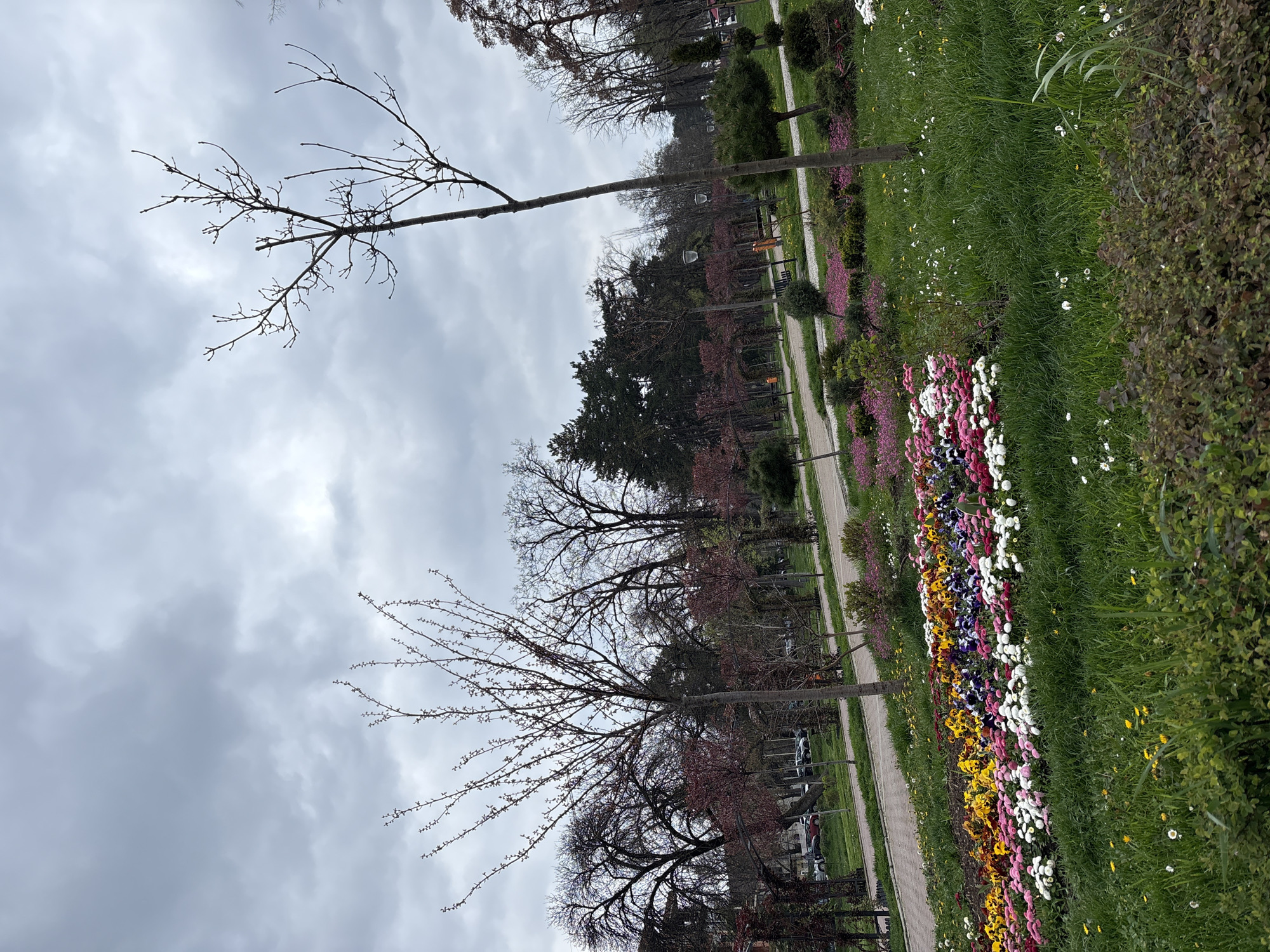 The image depicts a park scene in Kragujevac, Serbia, under an overcast sky. A pedestrian walkway runs through the park, bordered by flowerbeds with colorful blooms and interspersed with trees. The trees are mostly bare, suggesting early spring or late autumn. In the background, parked cars are visible, indicating proximity to a street. The overall impression is that of a quiet, urban park environment.