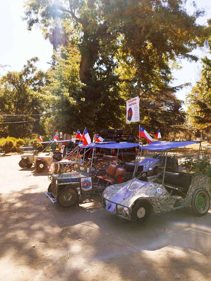 Four camouflage-patterned vehicles with blue canopies, adorned with Chilean flags, are parked in a row. A white sign with text in Spanish hangs above one vehicle. The first three vehicles have round tires and the last has square, green tires. A large tree with dense foliage and a palm tree stand in the background under a bright sky. The ground is paved with patches of shadows.