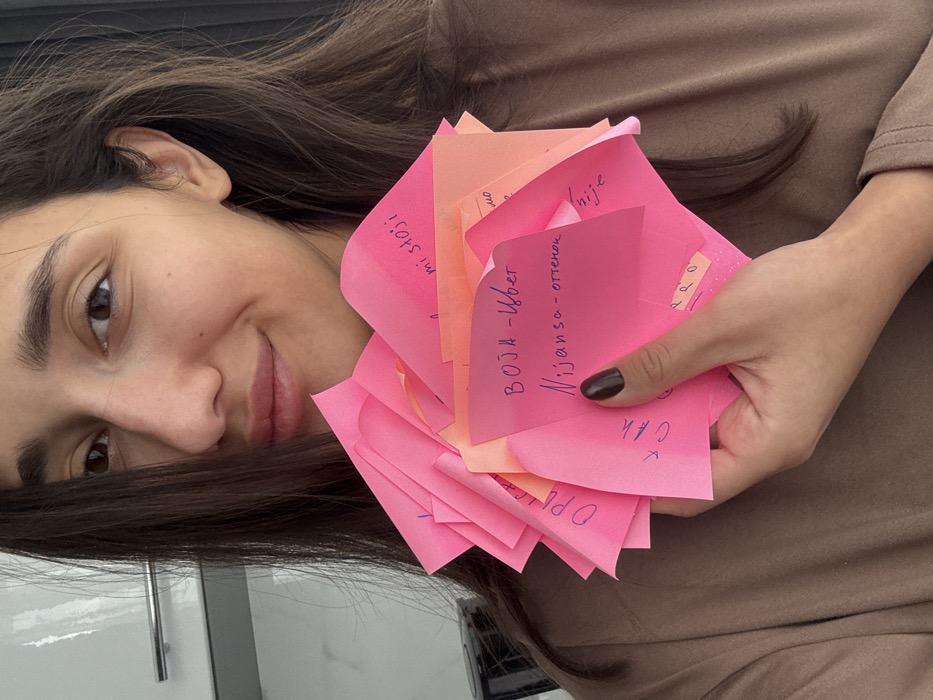 A female subject, seen from the mid-chest up, is centrally positioned, looking directly forward with a slight smile. Her long, dark brown hair cascades over her left shoulder and partially frames her face. She wears a brown long-sleeved garment. Her right hand, featuring dark brown nail polish on the thumb, holds a fanned cluster of approximately fifteen to twenty sticky notes, predominantly bright pink with some orange. Several notes display handwritten text in blue ink, primarily in Cyrillic script. A notable pink note contains the phrases "ВОЈА - Цвет" (VOJA - Tsvet / Color - Flower) and "Nijansa - оттенoк" (Nijansa - оттенoк / Nuance - Shade). The background is a blurred indoor environment, with a light-colored cabinet or wall unit and a horizontal metallic handle visible on the left side. The precise location within the city of Budva, Montenegro, is not discernible from the provided image.