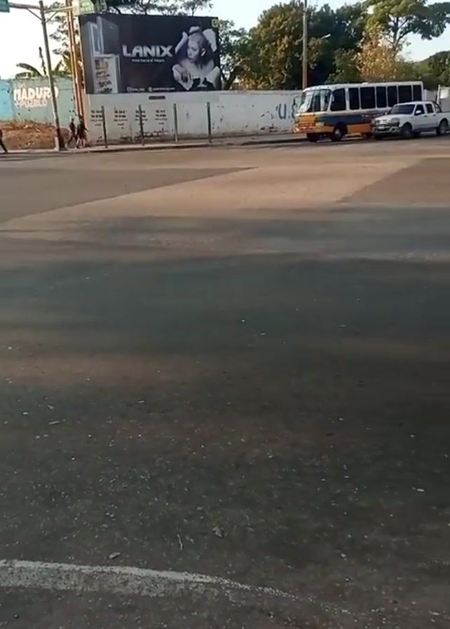 The video depicts an urban street scene during the daytime. In the background, there's a large billboard advertising a brand called "LANIX." There are several vehicles visible on the road, including a white pickup truck, a white SUV, and a yellow and black bus in the foreground. Other vehicles and motorcycles are further back. The road surface is asphalt with painted lane markers. The sky is clear. In the distance, there are trees and utility poles, along with a white wall featuring graffiti. A portion of another bus is visible on the right side of the frame.