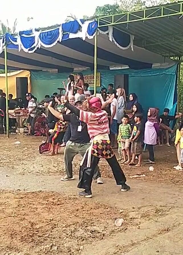 People are gathered outdoors, likely at a celebration or performance. A man in a patterned shirt and dark pants appears to be dancing or performing, while another person in traditional attire faces him. Behind them, a crowd of people, including some children, watch. A tent structure with blue and white decorations stands to the left, and another tent is visible in the background. The ground is dirt.
