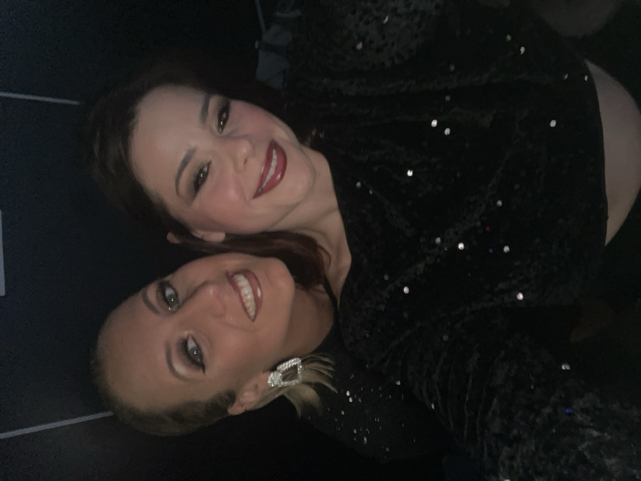 Two smiling women pose closely together. One woman, positioned at the bottom, has blonde hair pulled back, fair skin, and wears a sparkling earring. The other woman, above her, has auburn hair and deeper complexion, with red lipstick. Both wear dark clothing with sparkles. The background is dark, with a slightly visible light source near the top left.