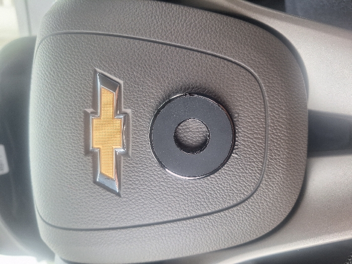 A close-up reveals a textured gray steering wheel hub. The Chevrolet bowtie emblem, a gold cross with silver trim, is prominently displayed. To the right, a black, circular magnetic phone mount is attached. The surrounding material of the steering wheel has a subtle leather-like texture. The overall scene is well-lit, highlighting the details of each element.