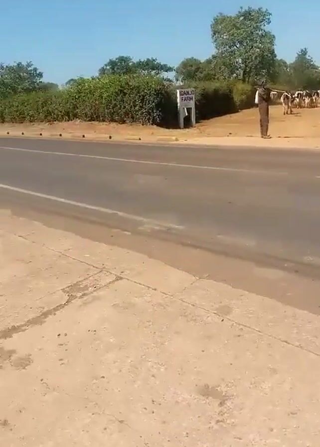 A man is standing near a road watching a herd of cattle. The cattle are on a grassy hill adjacent to the road. A truck and a car drive by on the road. The man walks off the side of the road, revealing a sign for “Canjo Farm.” The man then returns to the side of the road and continues watching the cattle.