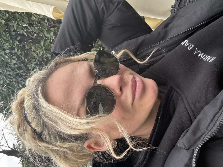 A close-up, slightly high-angle portrait features a female with blonde hair styled in a messy high bun with loose, wavy strands around her face. She wears dark, round-frame sunglasses with olive-green frames, obscuring her eyes. Reflections in the sunglasses depict an indoor scene with tables, glasses, and chairs. Her lips are slightly parted, indicating a subtle smile, with a glossy finish. A small, gold-colored stud earring, shaped like a four-leaf clover, is visible on her right earlobe. She is dressed in a black puffer jacket with a visible zipper, worn over a black hooded sweatshirt with white text "KARMA BAB" (likely "KARMA BABY") on the chest. Her left arm is partially visible, bent behind her head in a relaxed posture. The background consists of green foliage from shrubs or trees, along with a pale yellow fabric structure, possibly an awning or umbrella, and a section of dark, woven outdoor furniture. The scene is illuminated by natural light. While the location is specified as Sofia, Bulgaria, the image lacks specific identifiable landmarks to pinpoint an exact address or area within the city. The context suggests an outdoor seating area of a cafe or restaurant.