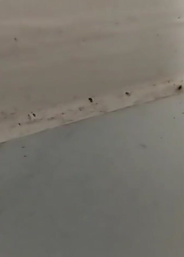 close-up of a white surface with a seam. There are several small, dark spots or objects along the seam. The overall appearance is slightly dirty or dusty.
