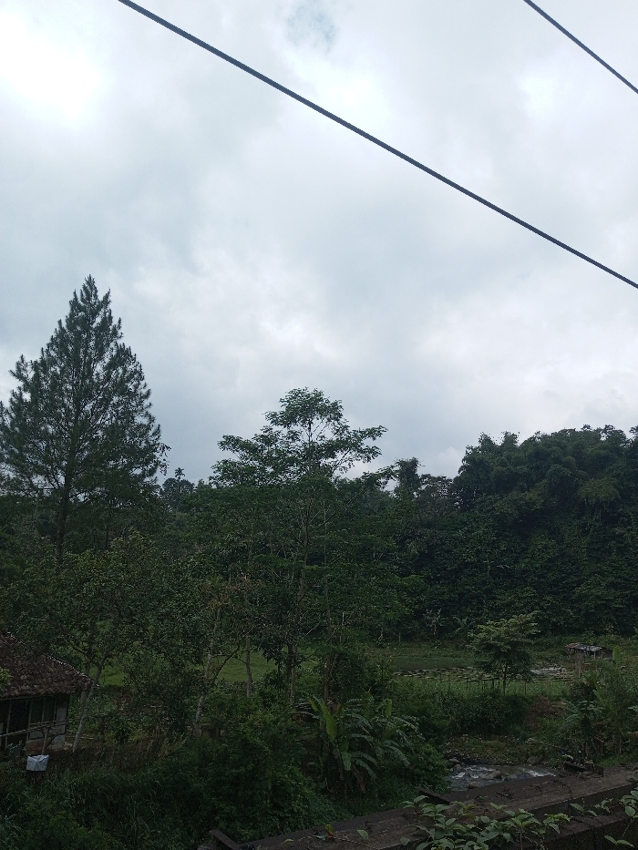 A landscape depicts lush greenery under a cloudy sky. Two prominent trees, one tall and pine-like, the other a broad-leafed deciduous, stand out against the backdrop of dense forest. Below, foliage spills onto the ground, with a small structure visible. A power line cuts across the top portion of the scene, disrupting the natural view. A small stream flows through the vegetation.