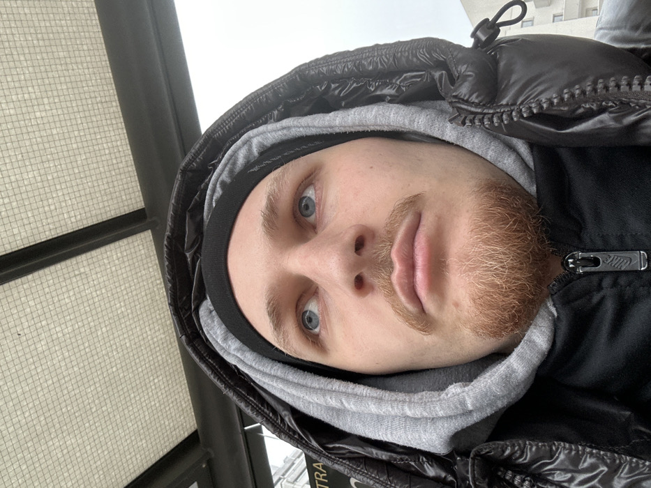 A young adult male is depicted in a close-up, upward-angled shot, looking slightly upwards and to his left with a neutral expression. He possesses light blue eyes, light brown eyebrows, and a reddish-blonde mustache and goatee. He is dressed in a black beanie, a grey hooded sweatshirt with the hood up, and a black, shiny puffer jacket with its hood pulled over the sweatshirt's hood. The jacket's front zipper features a silver-colored pull tab embossed with the "NIKE" logo. The individual is situated beneath a translucent, white grid-patterned overhead shelter, supported by a dark horizontal beam, indicative of a public transport stop. In the background, to the left, partially visible dark lettering "TRA" on a light sign suggests "TRAM" or similar transport-related signage, pinpointing the location to a public transport stop in Strasbourg, France. A light-colored building is visible in the distant background to the right, beneath an overcast sky.
