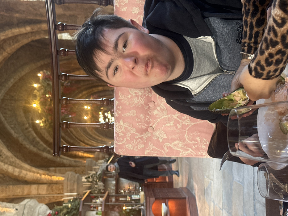 The image depicts an indoor dining scene in a vaulted stone hall in Cernay-la-Ville, France, adorned with Christmas decorations including garlands and candles. In the foreground, a young male with short dark hair and a light complexion is seated at a table, looking directly forward with a pursed-lip expression. He is wearing a grey t-shirt, a grey zippered hoodie with a "Superdry" logo, and a dark outer jacket. To his lower right, a person's arm, covered in a leopard-print sleeve and wearing a gold watch, holds a split avocado filled with a light-colored mixture towards the seated male. On the table, two wine glasses, a white plate with food remnants (including a pickle), and silverware are present. In the background to the left, a man in a dark overcoat and scarf walks away from the camera, holding a small red object, past a dark wood bar or serving station with bottles and shelves decorated with Christmas greenery. The overall environment features arched stone ceilings, pillars, and warm ambient lighting.