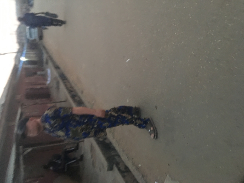 The scene depicts a paved street in Dadi Riba, Nigeria, under diffuse lighting conditions. In the foreground-midground, a person with light skin, wearing a dark cap, a blue and olive green patterned short-sleeved top, matching trousers, and dark sandals, stands with their body angled slightly right and head bowed downwards. To the immediate left, a blurry, dark-clothed individual is seated on a chair or bench beneath a dark awning, adjacent to a reddish-brown building with a raised curb along its base. The paved road surface exhibits scattered small, light-colored debris. Further down the street on the right, a dark-robed figure is observed walking away from the camera, carrying a dark bag or object in their left hand. A light-colored vehicle, possibly a van, is visible in the background, alongside additional structures lining the street.