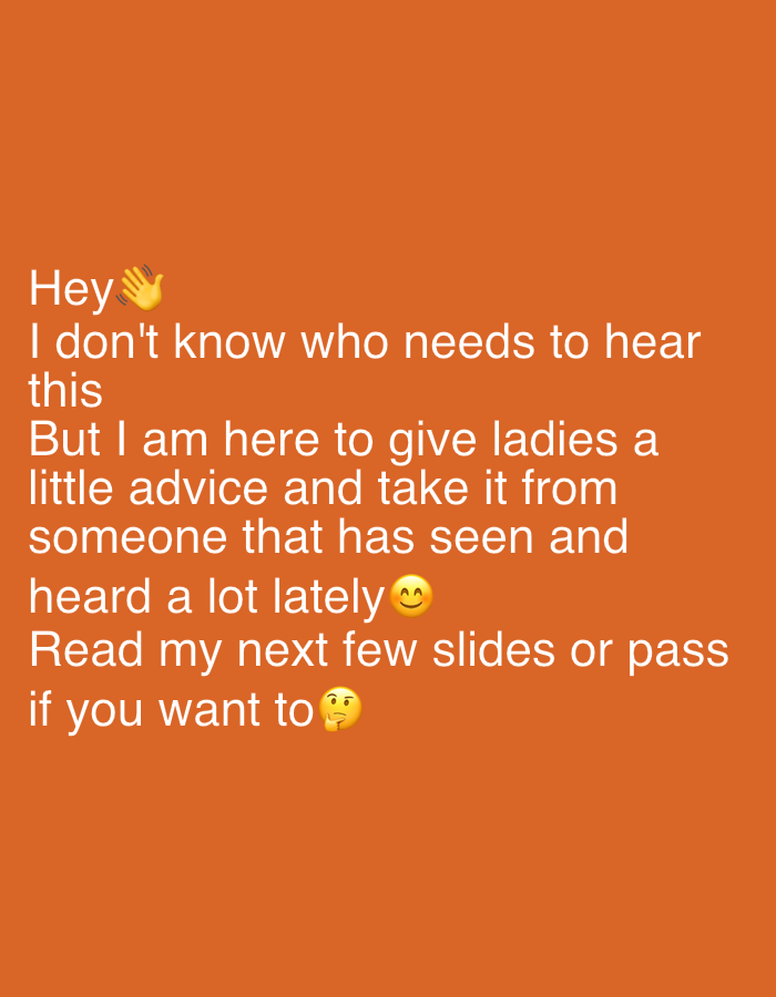 An orange-colored image displays a message written in white text. The message begins with a greeting, "Hey," accompanied by a waving hand emoji. The text states that the author intends to give ladies some advice, drawing from their recent experiences. It concludes by inviting the reader to view the next few slides or skip them if they prefer. The message incorporates two emojis, one representing smiling face with smiling eyes and the other representing thinking face.