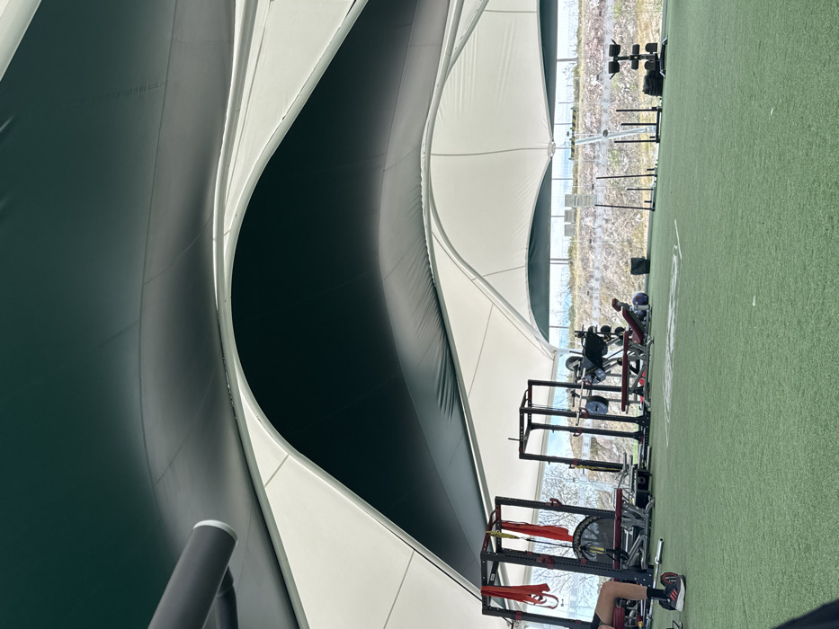 The image showcases a workout facility under a unique, tent-like structure with alternating dark and light panels. Weightlifting equipment, including squat racks and benches, is arranged on a green turf surface. In the background, a glimpse of an outdoor landscape can be seen through the transparent sections of the structure. A person can be seen working out near the equipment.