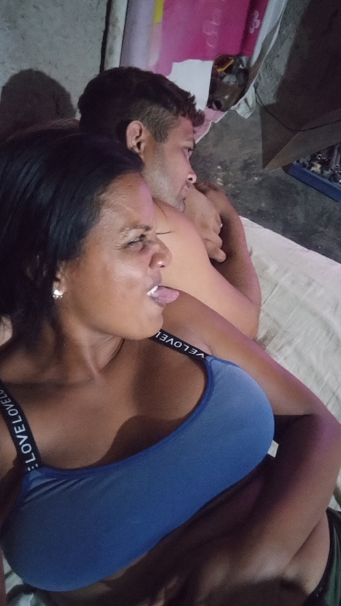 A woman with short dark hair sticks her tongue out with a grimace. She wears a blue tank top that says "LOVE" on the straps and a small stud earring. A man with short dark hair lies behind her, his arm around her, in what appears to be a bed with a white sheet. The background is cluttered with various items. The overall lighting suggests an indoor setting.