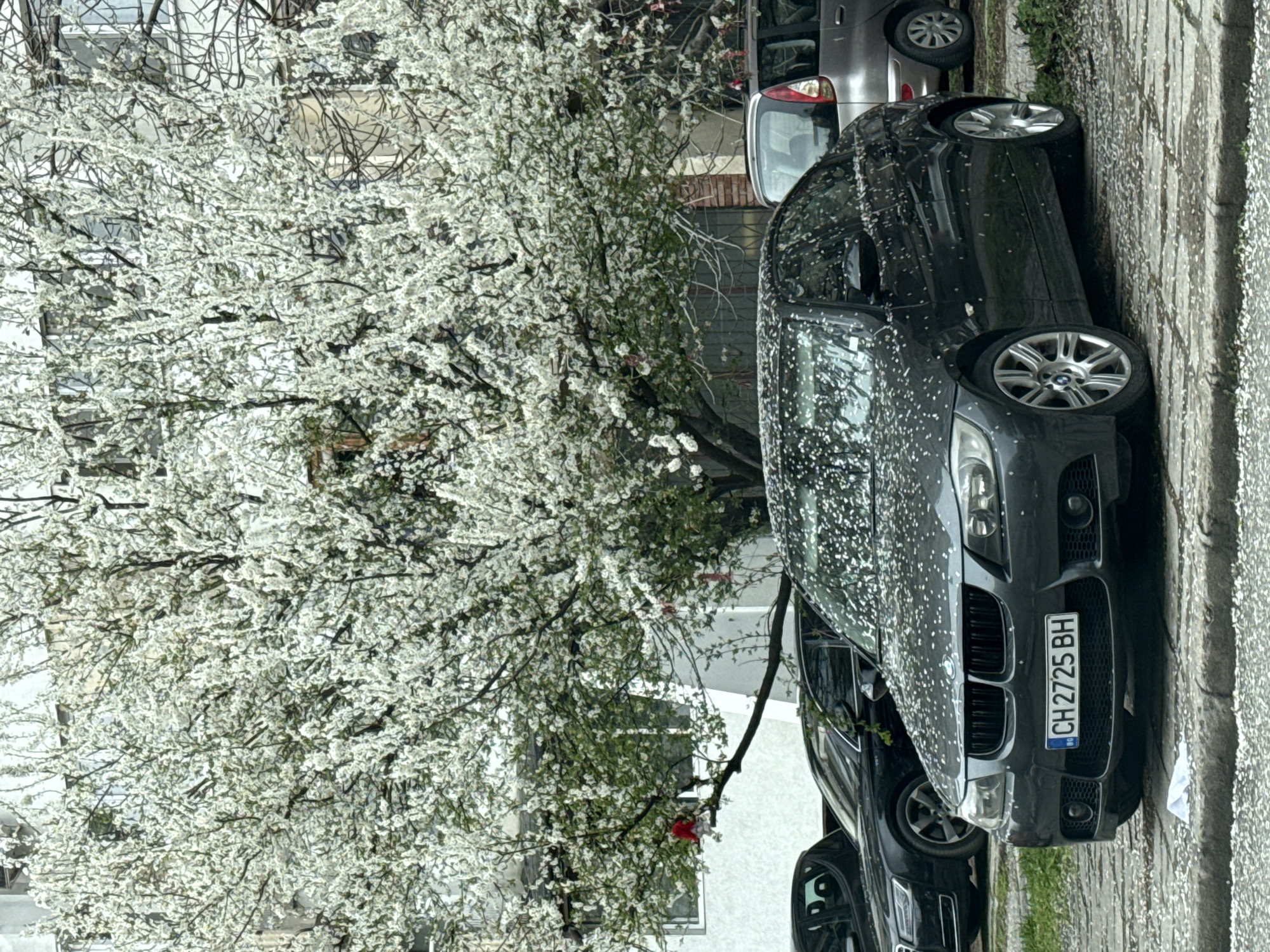 The scene depicts an urban environment in Plovdiv, Bulgaria, characterized by the onset of spring. A dark grey BMW 3 Series sedan, bearing Bulgarian license plate CH 2725 BH, is centrally parked on a surface composed of grey rectangular pavers. The vehicle's hood, windshield, and roof are extensively covered with fallen white flower petals. Directly above and partially behind the BMW, a large deciduous tree is in full bloom, densely covered with white blossoms and some emerging green leaves; several red fabric adornments are tied to its lower branches. To the immediate left of the BMW, a dark-colored sedan (possibly an Audi) is partially visible. To the right, a light brown or silver compact hatchback is parked further back. The ground area surrounding the BMW, including the pavers and a narrow strip of earth, is also liberally covered with white petals. A raised concrete curb runs in the foreground. In the background, behind the tree and vehicles, a light-colored, multi-story building with multiple windows is visible. A small piece of white material rests on the pavers near the front bumper of the BMW. No individuals are present in the image.