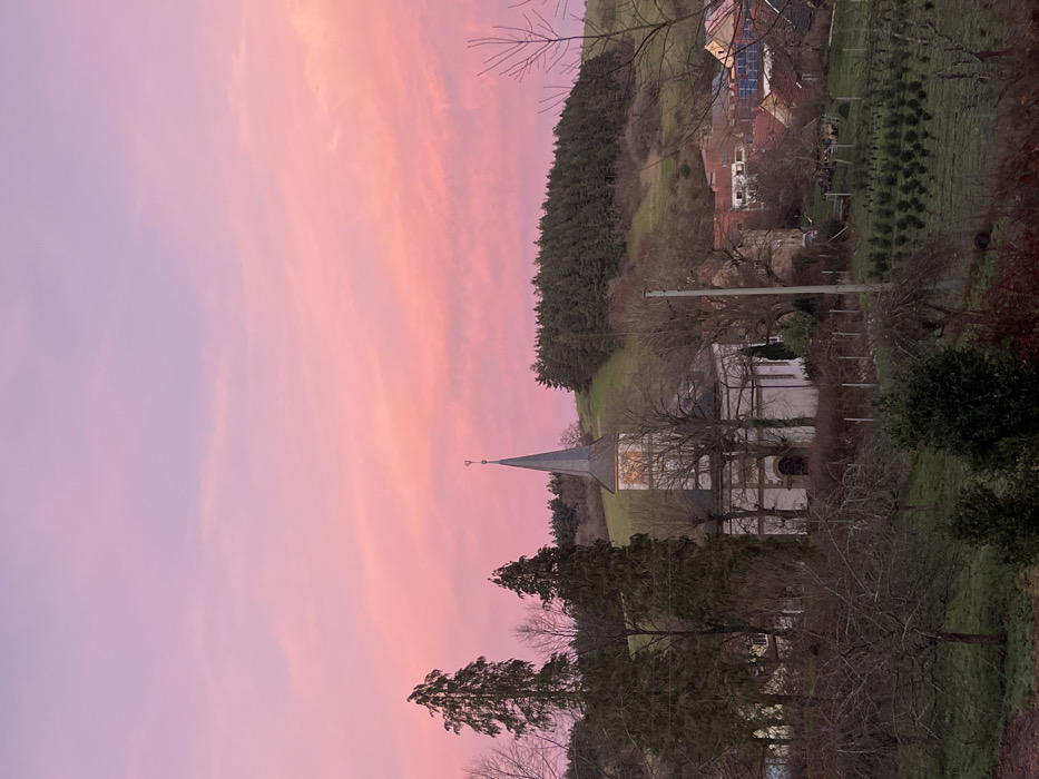 A vertical shot depicts a landscape under a pink and lavender sky. A church with a pointed steeple stands out amidst trees and greenery. A dense line of trees tops a hill, behind which are visible houses and a meticulously cultivated field. Bare branches add depth to the scene, framing the church against the vibrant sky.