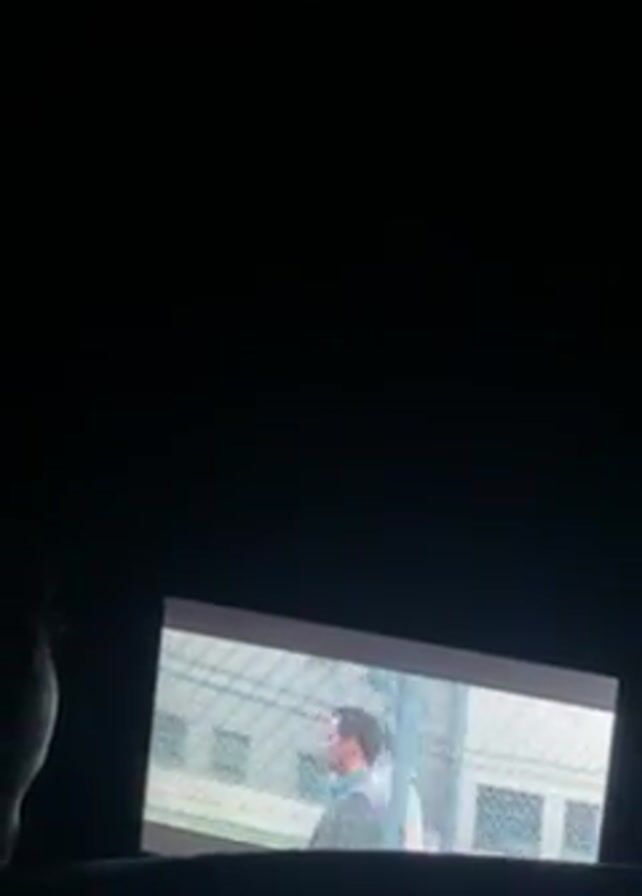 two men through a chain-link fence. The first man wears a dark jacket and looks forward. The second man wears a white shirt. They are in a large area outside, and the scene is washed in a grey light. The video is filmed from the perspective of someone watching the scene on a screen in a dark room.