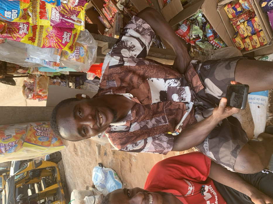 The scene depicts an outdoor street or market environment in Onitsha, Nigeria. Two African males are visible, both smiling and looking towards the camera. The primary subject, positioned centrally, is seated on a white sack, likely containing a commodity like sugar, with partial text "premium sucre" visible. He wears a short-sleeved, collared shirt with a brown, black, and white abstract pattern, and camouflage-patterned shorts. He has a short beard and a white wireless earpiece in his right ear. His right hand holds a dark-colored smartphone. His left arm rests on his hip. To the left, a second male is partially visible, wearing a red t-shirt with white lettering (partially visible "SCAR...th") and black wired earpieces around his neck. He is also smiling. The ground consists of reddish-brown dirt. In the background to the left, a yellow Keke Napep (tricycle taxi) is parked. To the right, a market stall structure, constructed with wooden beams, displays numerous packaged snack items. These include large bags of "Cheese Balls Family Pack," "Sweet Surprise" biscuits, "Creamy Crunch" wafers, "Xtra Shilx," and "NUNU" hanging in clear plastic bags. Below these, boxes of "Choco Banana" biscuits are stacked on the ground within the stall area. A white plastic bucket and a blue plastic-wrapped item are present on the ground to the far left.