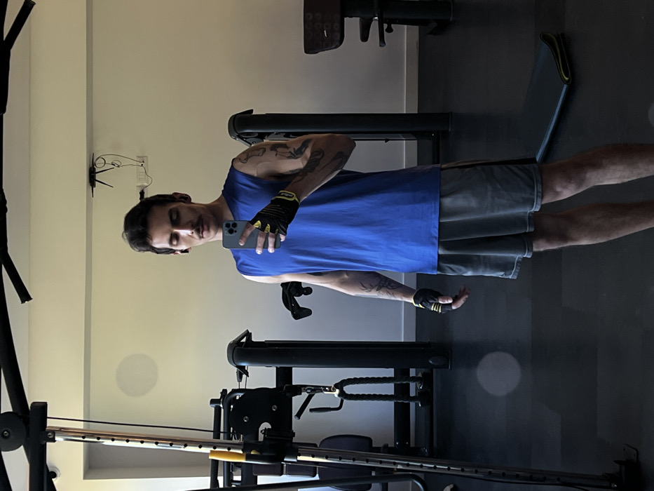 An indoor gym in Boreti, Montenegro, is depicted. A male adult, wearing a blue sleeveless shirt, grey athletic shorts with a black stripe, black and yellow fingerless fitness gloves, and black earbuds, stands centered, taking a mirror selfie with a grey smartphone held at chest height. He has a mustache and visible tattoos on both forearms. The gym features a dark, reflective floor and light-colored walls. Exercise equipment includes a multi-station cable machine on the left with a yellow handle, and other machinery with dark upholstery visible to the right. A rolled-up black mat rests on the floor in the lower right, and a small black tripod with associated wires is mounted on the upper right wall.