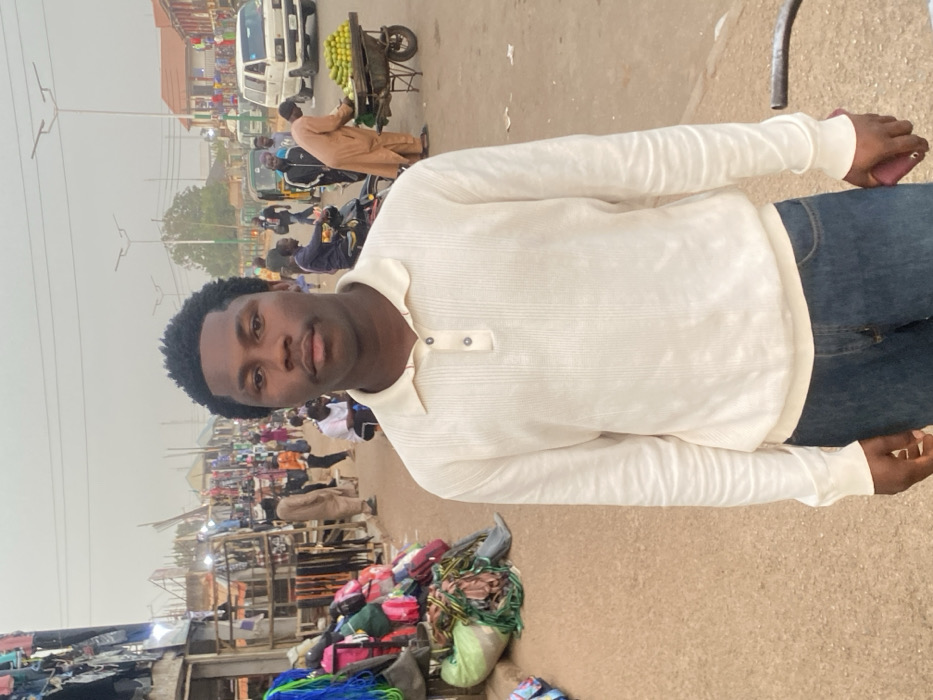 A young man in a light-colored, long-sleeved shirt and jeans stands in an outdoor market. He faces the camera directly. The background shows a bustling street scene with vendors, pedestrians, and vehicles. Some vendors have goods displayed on tables and carts. The sky is overcast.