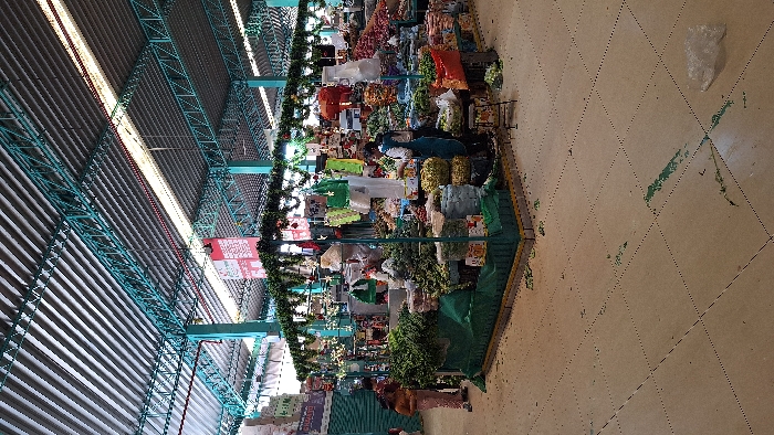 An indoor market scene shows a stall laden with various goods. Garlands decorate the stall's top. Vegetables, fabric-wrapped items, and clothing are visible. The stall is positioned on a patterned floor within a large building with a high, ribbed metal roof supported by blue-painted beams. A person is partially visible at the bottom of the stall. A plastic bag sits on the floor.