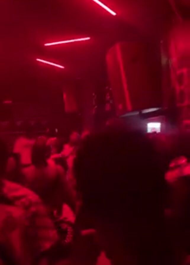 dimly lit indoor space with red neon lights on the ceiling, resembling a club. There are several people present, dancing and moving to music. Some individuals are partially visible in the foreground, while others are further back in the crowd. The lighting is predominantly red, making it challenging to discern specific details about the people and the environment. There are speakers visible in the background.