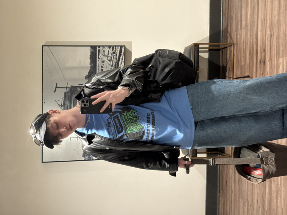 A person in a leather jacket, blue t-shirt with a graphic, and jeans stands indoors holding a phone. They wear a cap and sunglasses, and a backpack is draped over their shoulder. Behind them is a framed black and white photograph and a small metal table. A suitcase lies on the wooden floor beside them. The person appears to be taking a picture of themself in a mirror.