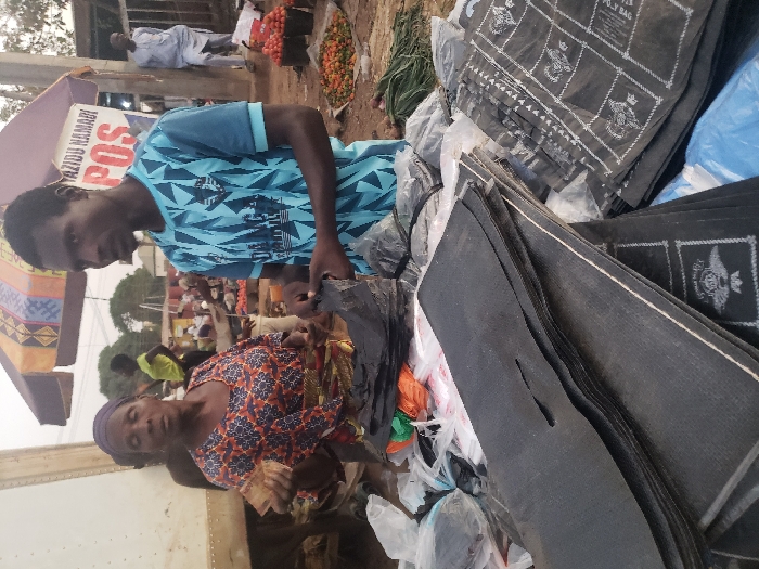 At an outdoor market, a person in a blue patterned shirt stands behind a woman with a headscarf and a patterned top. They appear to be handling or selling black polyethylene bags with printed designs. Stacks of these bags are visible. Other market stalls and individuals are in the background, including a fruit vendor and a person in white. The overall scene suggests a commercial transaction.
