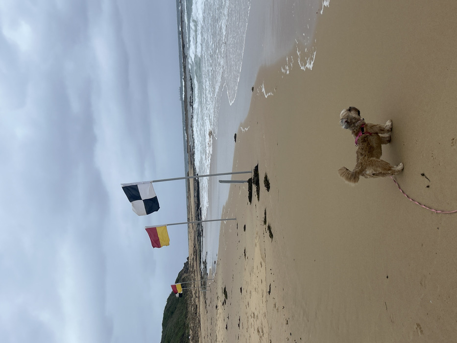 A dog with a pink harness and leash stands on a sandy beach next to lifeguard flags. The sky is overcast. The flags are black and white, yellow and red, and red and yellow. The ocean waves are visible in the background, as are some rocks. The beach slopes upwards into a grassy area.