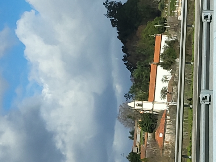 The image displays a panoramic view of a religious edifice and adjacent structures situated on a hillside in Cambra e Carvalhal de Vermilhas, Portugal. The primary subject is a white church with a prominent, pointed bell tower located towards its western end and an orange-tiled roof extending along its length. Several other buildings, also featuring orange-tiled roofs, are visible around the church, integrated into the ascending terrain. Dense vegetation, comprising both deciduous trees with bare branches and numerous evergreen trees, covers the hillsides and a large, forested mountain rising behind the structures. In the foreground, a silver-grey metal barrier, consistent with a highway guardrail, traverses the lower portion of the frame. The sky above is characterized by a mix of clear blue patches and extensive white and grey cumulus clouds. No individuals, discernible actions, or interactions are present within the scene.