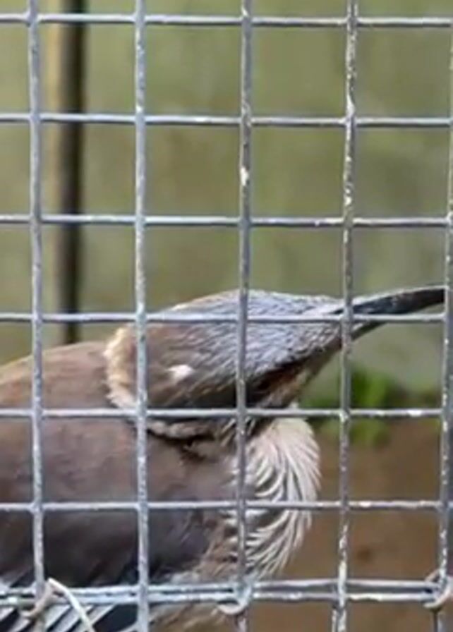 brown and white bird inside a wire cage. The bird has a long, curved beak and red eyes. It cocks its head and then squawks once. The background is blurry, but appears to be green foliage.
