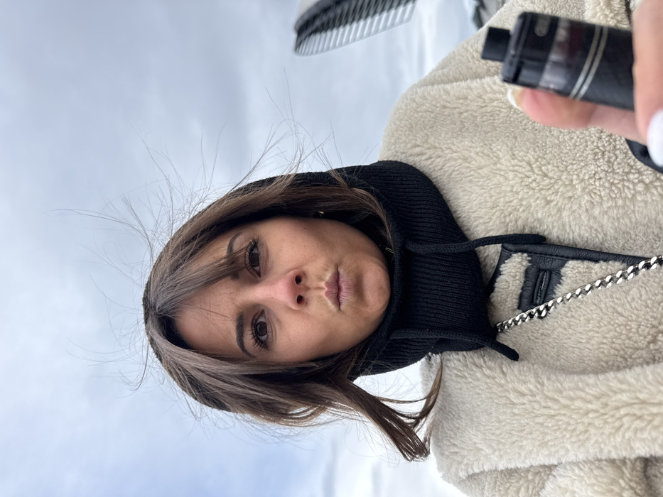 An adult female is depicted in a close-up, chest-up selfie format, looking directly into the camera with a slightly pouting expression. Her brown hair, styled with bangs, appears windswept. She is wearing a black ribbed hooded neck warmer covering her head and neck, along with a light-colored, possibly cream or beige, sherpa fleece jacket. A silver chain strap, likely from a bag, is visible over her left shoulder. In the foreground, out of focus, she holds a dark-colored vaping device with a white-painted fingernail on her right hand. The background features an overcast sky and, to the right, a portion of a modern building with angular, possibly metallic or glass, reflective surfaces. This scene is located in Colombier-Saugnieu, France, likely near the Lyon-Saint Exupéry Airport due to the visible architecture.