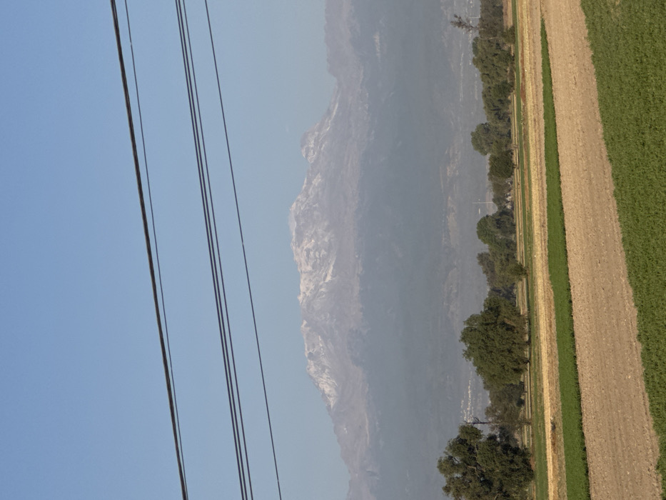 This image depicts an expansive outdoor scene in Santa Ana Xalmimilulco, Mexico, under a clear, light blue sky. Three parallel, dark-colored power lines traverse horizontally across the upper third of the frame. In the distant background, a prominent mountain range, consistent with Iztaccihuatl, spans the horizon; its upper elevations are distinctly covered in white snow, while its lower slopes appear veiled by a gray-blue atmospheric haze. The midground features a discontinuous line of scattered trees with varying green foliage. Behind these trees, faint, dispersed structures indicative of a distant settlement are subtly visible. The foreground is composed of agricultural fields divided into distinct horizontal sections. These sections vary: some consist of light brown, bare earth; others display vibrant green, low-lying crops; and a few show dry, yellow-brown vegetation. No individuals, animals, or direct human actions are observable within the frame. The environment is rural, showcasing agricultural land and a significant natural landmark.