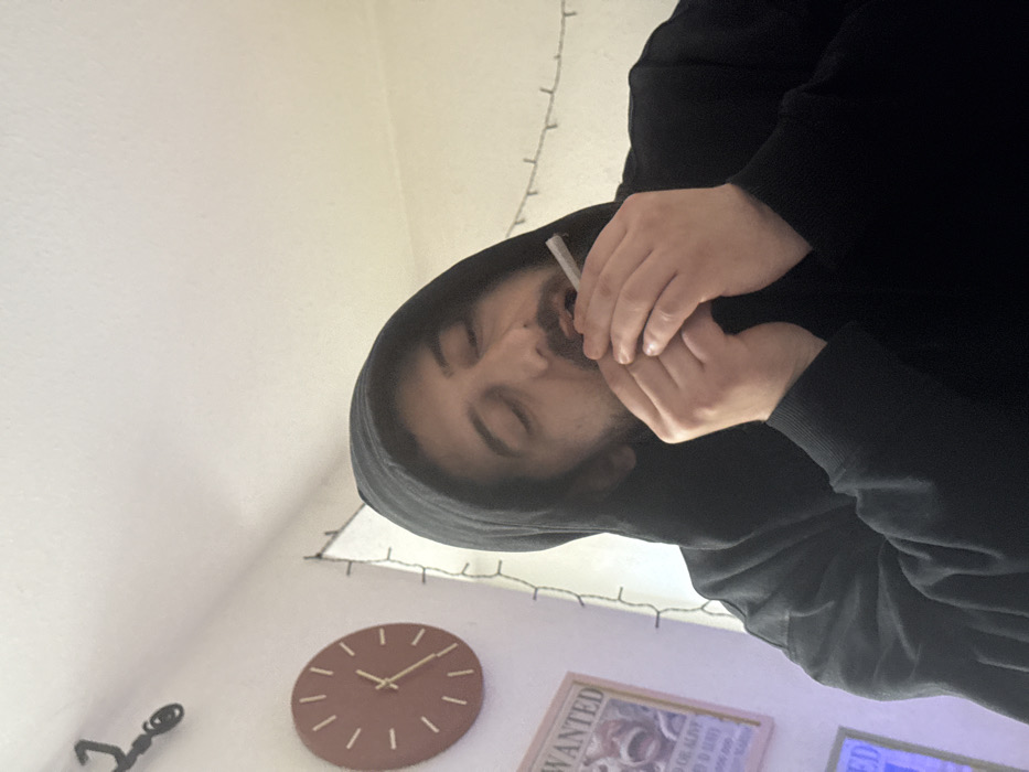 A male individual is depicted indoors, in what is stated to be the city of Strasbourg, France. He is wearing a black hooded sweatshirt with the hood up, partially obscuring his face. He has a beard and appears to have his eyes partially closed or looking downwards. His hands are cupped, holding a hand-rolled cigarette to his mouth, indicating the act of preparing to smoke or smoking. The background features a light-colored wall. A round, reddish-brown wall clock with gold markers and hands, showing approximately 11:15, is mounted on the wall to the left. Below the clock, a framed poster displaying "WANTED" and "DEAD OR ALIVE" text, along with an illustrated character, is partially visible. A string of small white lights is vertically strung in the background, possibly along a window frame or wall edge. The ceiling is plain white.