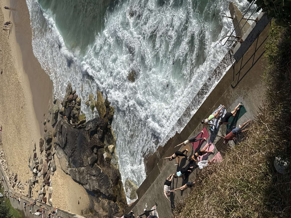 From an elevated perspective, the image showcases a coastal scene. A beach borders turbulent ocean waves. A concrete structure parallels the shoreline, where several individuals practice yoga on mats. Lush greenery grows adjacent to the concrete. Additional people are visible on the beach and rocks near the ocean's edge.