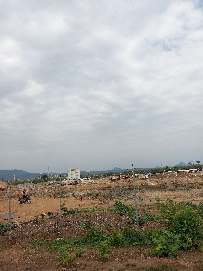 A person rides a motorcycle on a dirt road in front of a chain-link fence. The fence encloses an industrial area with a building, various vehicles, and other structures. The area appears to be under construction, with debris and dirt scattered about. The sky is overcast with clouds. The scene is located in Ohunene, Nigeria, at coordinates 7.497 latitude and 6.671 longitude.