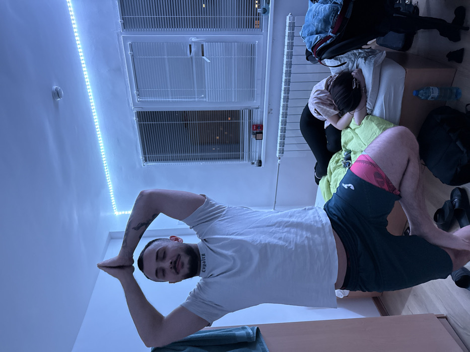 The scene depicts an interior room in Sofia, Bulgaria, illuminated primarily by a cool-toned blue LED strip light running along the ceiling. A light-skinned male with short dark hair and a beard, wearing a light-colored short-sleeved t-shirt with "Loyalty" written on the collar and dark shorts over pink patterned boxer briefs, stands barefoot in the foreground on the left. He is performing a yoga pose, balancing on his left leg with his right foot placed against his inner left thigh, hands clasped together above his head, and eyes closed. A tattoo is visible on his left bicep. To the right, a second individual, appearing to be a light-skinned female with dark hair, is lying on her side on a single bed, facing away from the camera. She is wearing a light shirt and dark pants/leggings and appears to be asleep or resting under a light green duvet. The bed is situated beneath a large window fitted with horizontal blinds, through which a dark, unidentifiable exterior and distant lights are visible, indicating nighttime. Below the window is a white wall-mounted radiator. The room features a light-colored wooden wardrobe on the far left, with a light-colored towel or garment draped over its side. A white smoke detector is affixed to the ceiling. On the wooden floor, near the bed, are a plastic water bottle, a dark backpack or bag, and a pair of dark slide-on slippers. A chair with a denim jacket and another dark bag draped over it is partially visible next to the bed on the right.