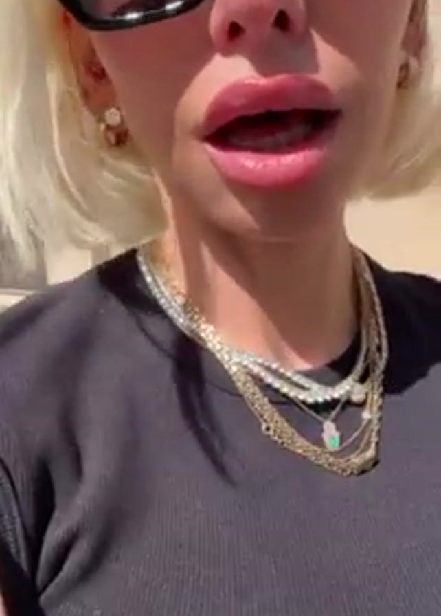 A light-skinned woman with blonde hair is holding the camera close to her chest. She is wearing sunglasses, a black shirt, gold earrings, and multiple gold necklaces. She is pointing to her necklaces, speaking, and appears to be outside on a sunny day. The background consists of an out-of-focus tan-colored building.