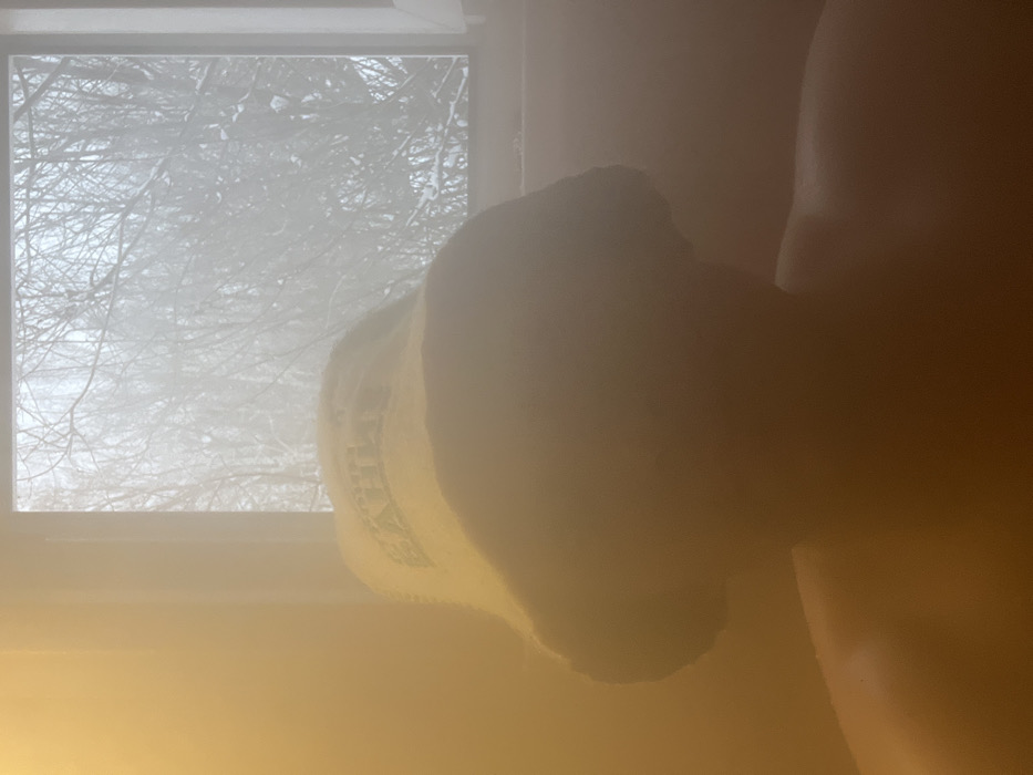 The image displays an individual located indoors in Vasilyevo, Russia, within a warm, hazy environment consistent with a sauna or steam room. The person, positioned in the foreground, is largely obscured; their face is not visible. They wear a light-colored bucket hat, on which dark lettering, partially visible as "SAHA," is present. The individual's bare shoulders and upper chest are discernible, displaying warm-toned skin. In the background, a rectangular window reveals an exterior winter scene: bare-branched trees are heavily coated in snow, set against an overcast grey sky. The indoor space is illuminated by a predominant warm, yellowish-orange light source, contributing to the atmospheric haze. No active interactions or specific actions are depicted beyond the individual's presence in the scene.