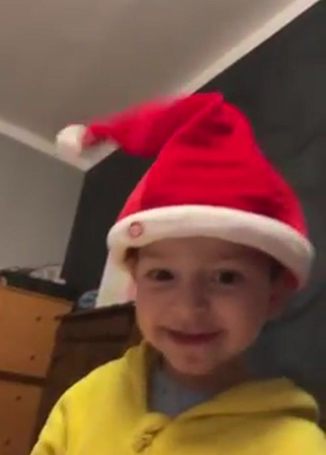 A young boy wearing a red and white Santa hat and a yellow hooded sweatshirt is smiling and looking at the camera. He is holding and eating a slice of pizza. The background includes a dresser, a gift bag, and a wall with a patterned design. The lighting is indoor and appears to be from artificial sources. The camera is handheld and slightly shaky. The boy wags his hat.