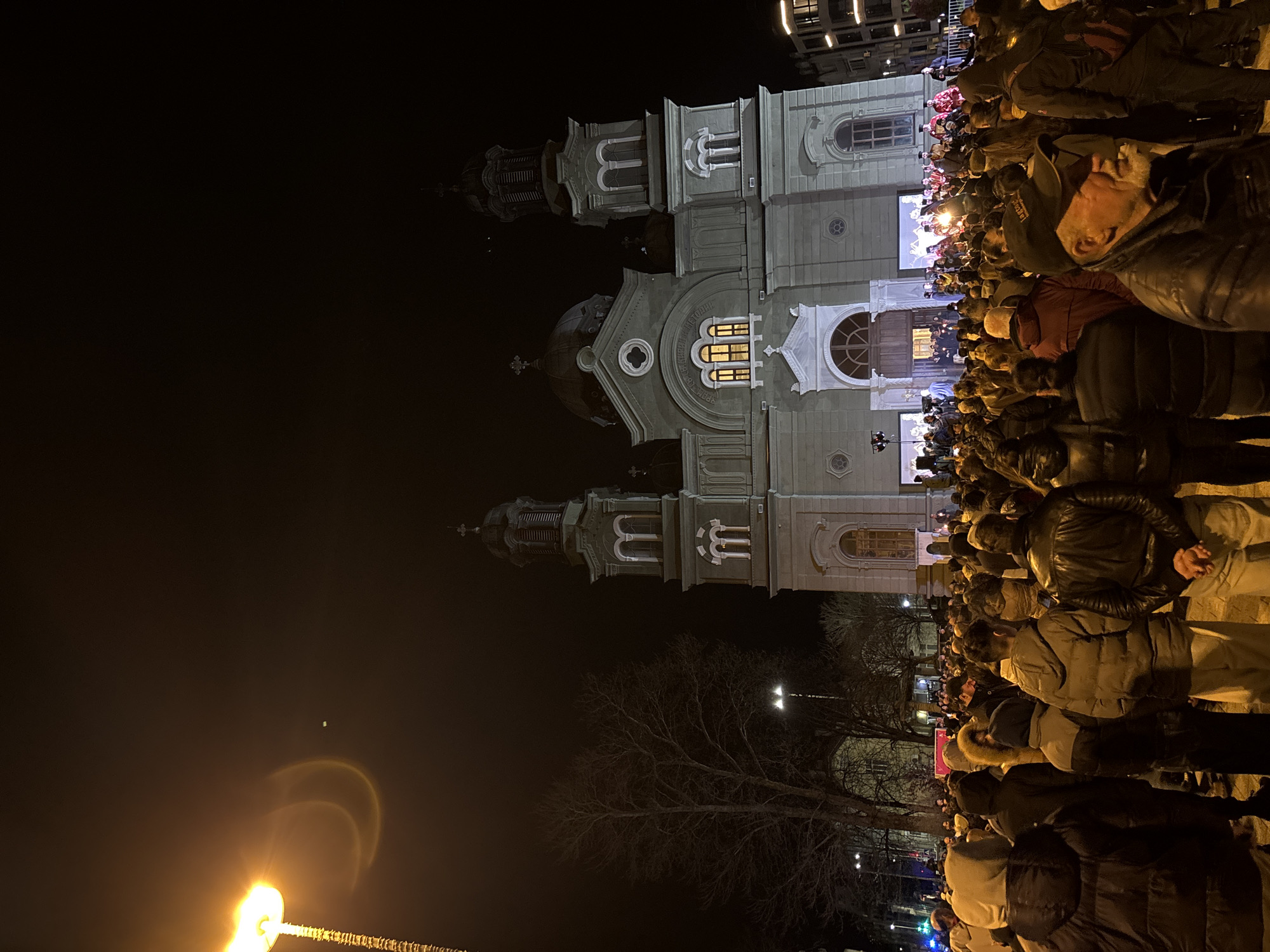 Saints Cyril and Methodius Cathedral in Burgas, Bulgaria, at night. A large crowd of people is gathered in front of the cathedral. The cathedral is illuminated, and its architectural details are visible. A bare tree is located in front of the cathedral on the left. A street lamp illuminates the lower left of the image.