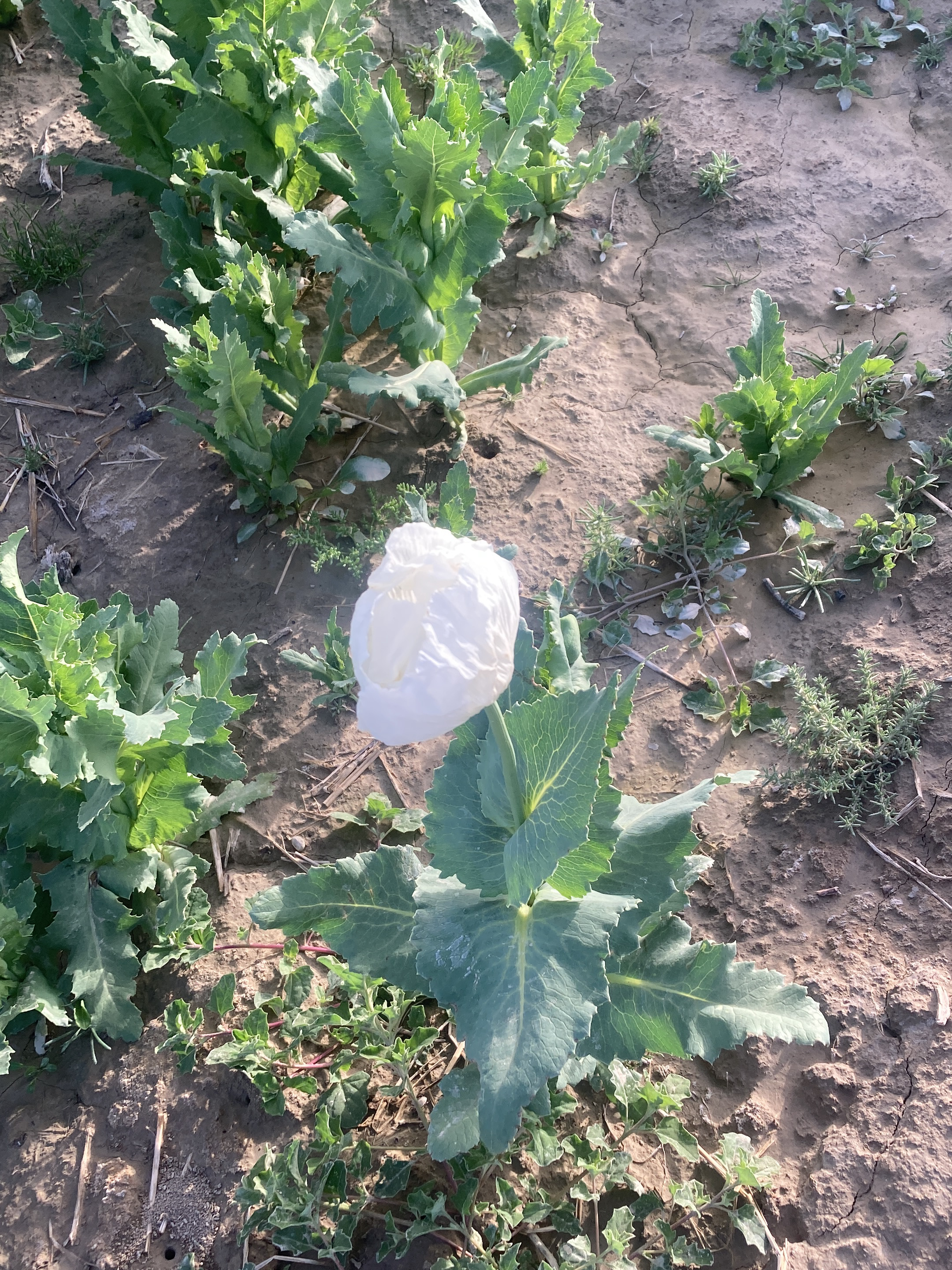 A close-up view showcases a cultivated field with rows of green plants. One plant stands out with a large, white, closed flower bud. The soil is dry and cracked with sparse, smaller green plants and weeds interspersed. The lighting suggests an outdoor setting under daylight. The leaves are broad and have serrated edges, typical of flowering plants grown in cultivated soil.