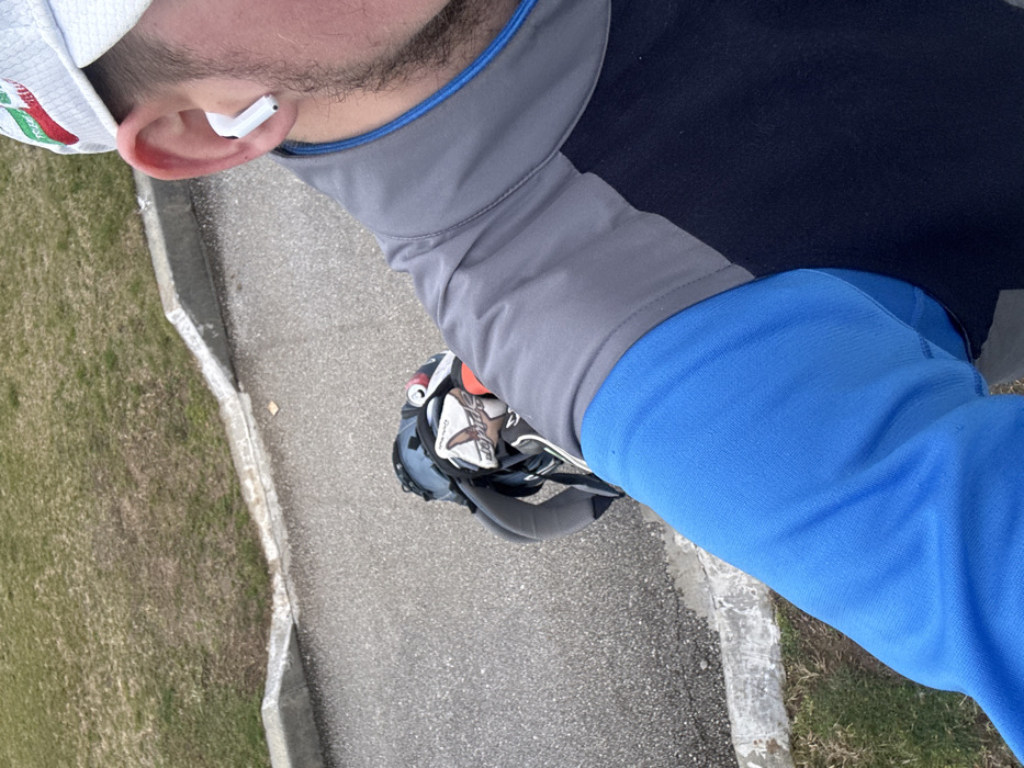 The image presents an outdoor, elevated perspective of a male individual and golf equipment in the city of Razliv, Bulgaria. The subject's right profile is visible, encompassing a portion of his face, ear, and jawline with stubble. He wears a white baseball cap featuring a red, white, and green band on the bill, and a white wireless earbud is inserted into his right ear. His attire includes a bright blue long-sleeved garment beneath a layered outer vest or jacket with a grey upper section, navy blue main body, and a blue accent line along the collar. To the left of the subject, resting on a grey asphalt surface, is a dark-colored golf stand bag containing multiple golf clubs, one fitted with a white headcover displaying red accents and "Spider" branding. A silver beverage can is visible in an exterior pocket of the golf bag. The paved area is bordered by a light grey concrete curb, beyond which lies a sparse, light green grassy expanse.