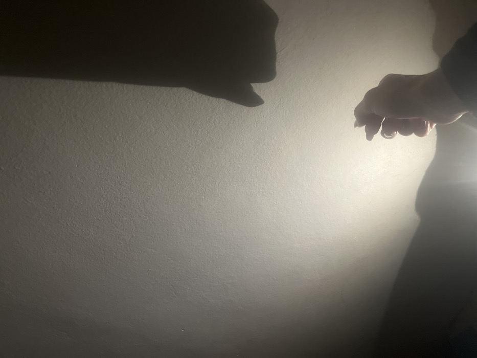 Against a textured, dimly lit wall, a shadow of a hand forms an ominous shape